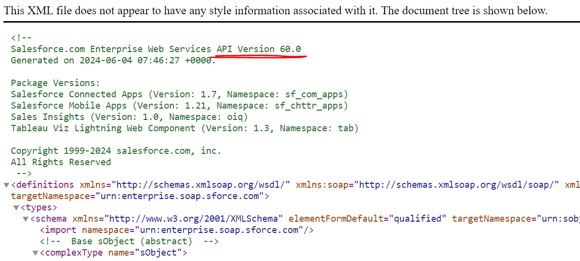 Setup > API > Generate Enterprise WSDL > Generage 버튼 클릭하여 나오는 XML 파일 최상단 주석부분에서 현재 API Version을 확인할 수 있다.